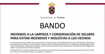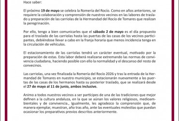 El Ayuntamiento de Tomares informa a los vecinos, mediante el siguiente Bando Municipal, sobre las medidas a adoptar en el traslado para la preparación de las carriolas de la Hermandad del Rocío para la Romería de 2026, que se...