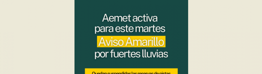 ESTE MARTES, 13 DE ENERO: AEMET ACTIVA “AVISO AMARILLO” POR INTENSAS LLUVIAS: SUSPENSIÓN DE RESERVA DE PISTAS Y DE LAS CLASES DE LAS ESCUELAS DEPORTIVAS MUNICIPALES AL AIRE LIBRE