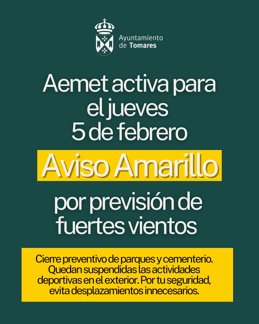 El Ayuntamiento de Tomares informa que, este jueves, 5 de febrero, la Agencia Estatal de Meteorología (AEMET) activa de nuevo “Aviso Amarillo” por previsión de fuertes vientos y lluvias persistentes. Con el fin de preservar la seguridad de los ciudadanos, se cierran, de manera preventiva, los parques y el cementerio. También se suspenden las actividades deportivas en el exterior. Disculpen las molestias.