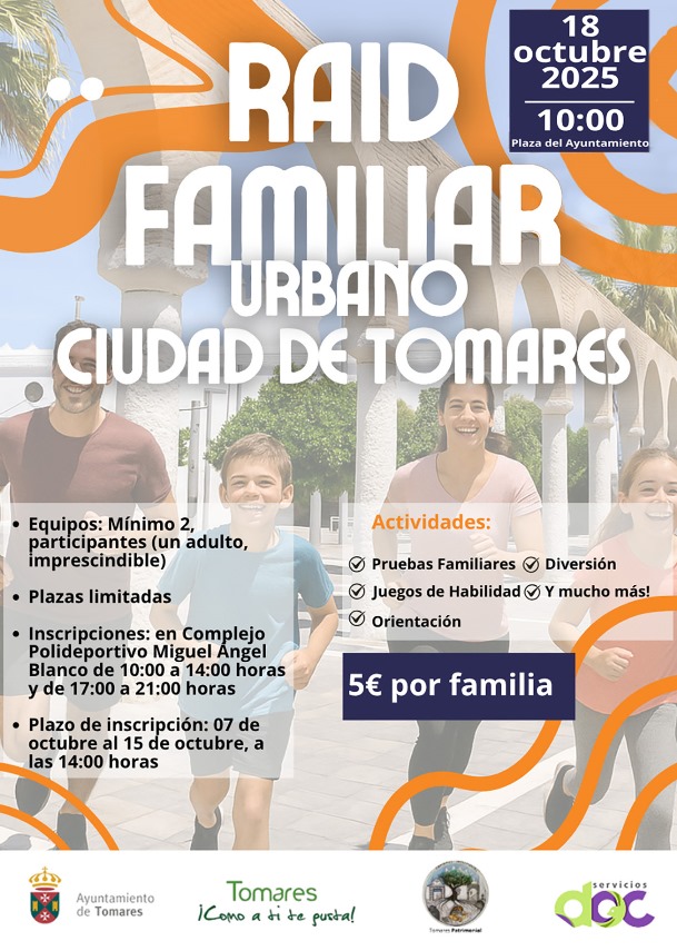 ¿Te gustaría pasar un gran día de otoño disfrutando con los peques de actividades de orientación, juegos de habilidad, retos deportivos y muchas sorpresas? El Ayuntamiento de Tomares ha organizado una nueva edición del Raid Familiar, el sábado, 18 de octubre, que esta vez será “urbano”, por las calles de Tomares. La salida será a las 10 horas de la mañana desde la Plaza del Ayuntamiento. Habrá premios para las familias ganadoras: trofeos y una actividad familiar gratuita. ¡Apresúrate, las plazas son limitadas! Abierto el plazo de inscripción hasta el miércoles 15 de octubre