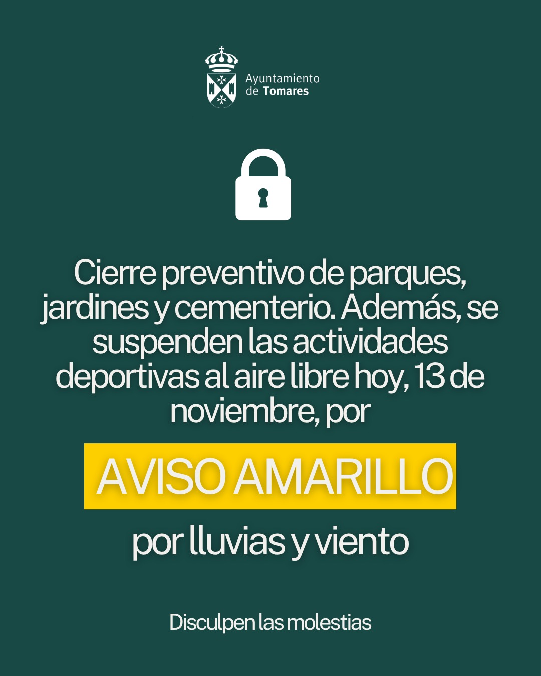 Vive Tomares/Agenda/JUEVES, 13 DE NOVIEMBRE: AVISO AMARILLO POR LLUVIAS Y VIENTO: CIERRE PREVENTIVO DE PARQUES, JARDINES Y CEMENTERIO. SE SUSPENDEN ACTIVIDADES DEPORTIVAS AL AIRE LIBRE
