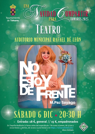 El Ayuntamiento de Tomares informa que la comedia “No estoy de frente”, dirigida por Chiqui Carabante y Paco León, y protagonizada por la reconocida actriz de la escena española Mari Paz Sayago, que por motivos meteorológicos no se pudo representar el pasado viernes, 14 de noviembre, se ha trasladado al sábado 6 de diciembre, a las 20:30 horas, en el Auditorio Municipal Rafael de León. Importante: Las entradas adquiridas para el día 14 seguirán siendo válidas para esta nueva fecha. Y los que deseen comprar la entrada, aún quedan algunas entradas disponibles: https://www.giglon.com/todos?idEvent=no-estoy-de-frente