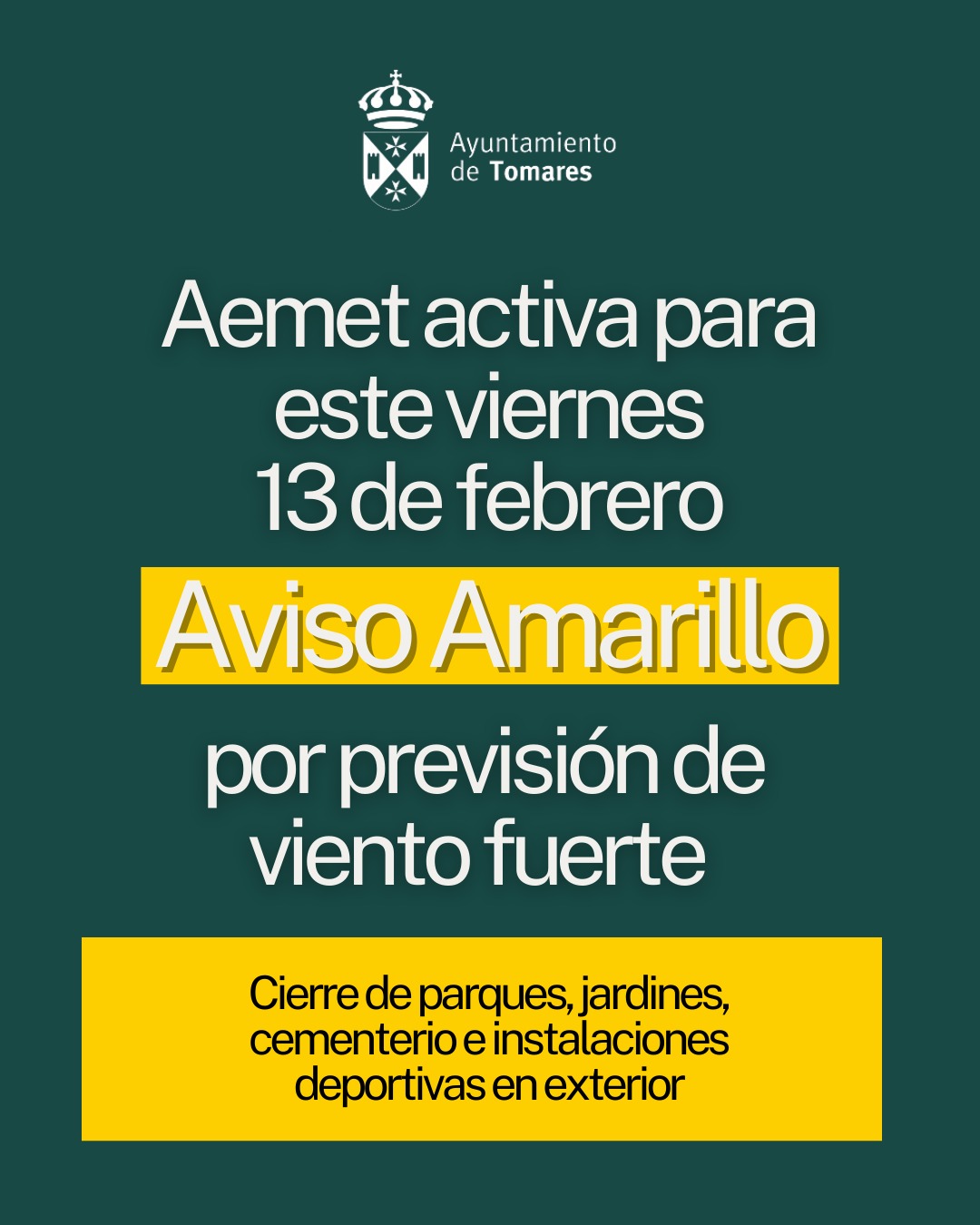 Vive Tomares/Agenda/VIERNES, 13 DE FEBRERO: AEMET ACTIVA "AVISO AMARILLO" POR FUERTES VIENTOS: CIERRE DE PARQUES, JARDINES, CEMENTERIO E INSTALACIONES DEPORTIVAS AL AIRE LIBRE