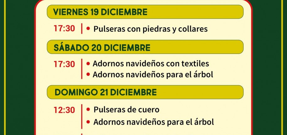 VIERNES 19, SÁBADO 20, DOMINGO 21 Y LUNES 22 DICIEMBRE: TALLERES EN LA PLAZA DEL AYUNTAMIENTO