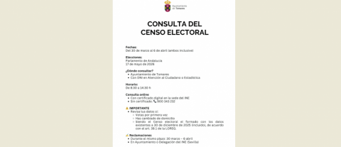 DEL 30 DE MARZO AL 6 DE ABRIL: EXPOSICIÓN PÚBLICA DEL CENSO ELECTORAL PARA LAS PRÓXIMAS ELECCIONES AL PARLAMENTO DE ANDALUCÍA DEL 17 DE MAYO DE 2026