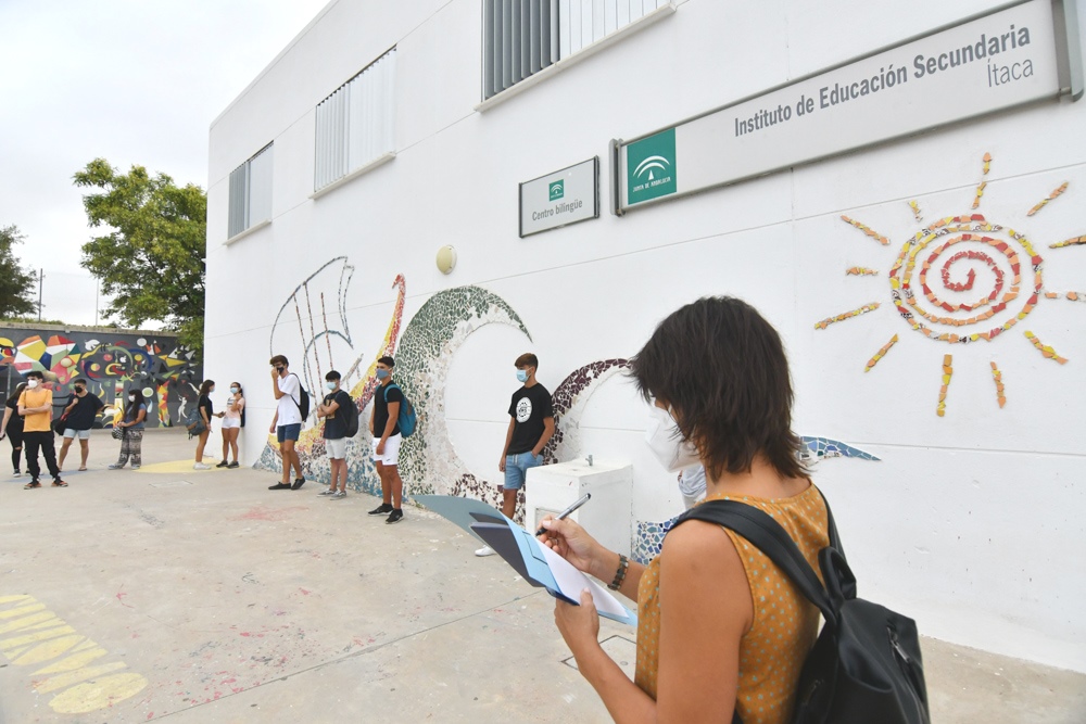 1.682 estudiantes de Secundaria se incorporan a las clases en el instituto en Tomares en este nuevo curso 2020-21. Una entrada escalonada por cursos, que ha comenzado esta mañana a las 9:30 horas y que continuará hasta el viernes 18 de septiembre, para cumplir con todas las medidas de seguridad y de prevención anti-Covid dictadas por las autoridades sanitarias.