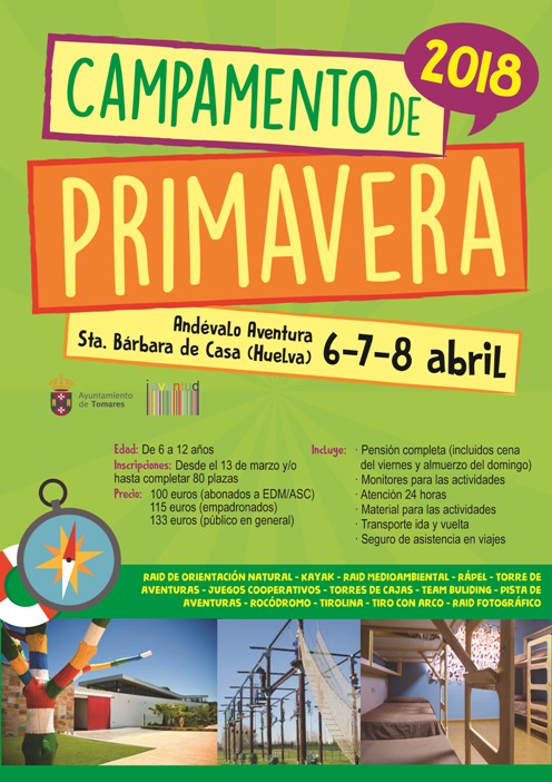 Desde ayer, 12 de marzo, los pequeños más aventureros pueden inscribirse en una nueva edición del Campamento de Primavera que, cada año, organiza el Ayuntamiento de Tomares. El plazo para apuntarse a esta divertida aventura se cerrará una vez que se hayan cubierto las 80 plazas disponibles para este 2018.