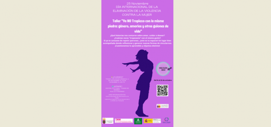 El Ayuntamiento de Tomares ha organizado con motivo del Día Internacional de la Eliminación de la Violencia contra la Mujer (25 de noviembre), el Taller "Ya NO Tropiezo con la misma piedra: Género, Amoríos y otros Guiones de Vida", que se imparte todos los jueves hasta el 18 de diciembre, de 17 a 19 horas, en el Centro Cultural Tomás de Ybarra (aula 2.6). Plazas limitadas. Inscripción hasta este jueves, 30 de octubre a través del código QR del cartel o el enlace: https://forms.gle/HvwwdaGmyBM2kGEJ6