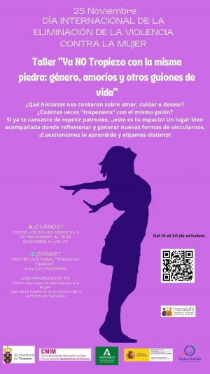 El Ayuntamiento de Tomares ha organizado con motivo del Día Internacional de la Eliminación de la Violencia contra la Mujer (25 de noviembre), el Taller "Ya NO Tropiezo con la misma piedra: Género, Amoríos y otros Guiones de Vida", que se impartirá desde el 6 de noviembre al 18 de diciembre, los jueves, de 17 a 19 horas, en el Centro Cultural Tomás de Ybarra (aula 2.6). Plazas limitadas. Inscripción hasta este jueves, 30 de octubre a través del código QR del cartel o el enlace: https://forms.gle/HvwwdaGmyBM2kGEJ6