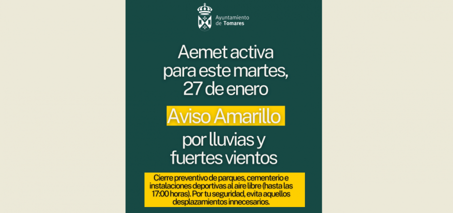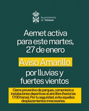 El Ayuntamiento de Tomares informa que, este martes, 27 de enero, debido al Aviso Amarillo por lluvias y fuertes vientos activado por la Agencia Estatal de Meteorología (AEMET) y con el fin de preservar la seguridad, se cierran, de manera preventiva, hasta las 17:00 horas, los parques, cementerio e Instalaciones Deportivas Municipales (EDM) que se desarrollan al aire libre. Disculpen las molestias.