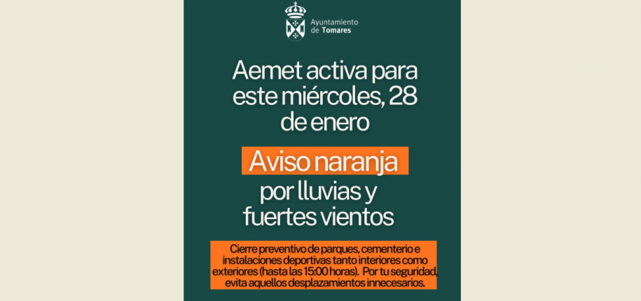 El Ayuntamiento de Tomares informa que, este miércoles, 28 de enero, debido al Aviso Naranja por fuertes vientos y lluvias activado por la Agencia Estatal de Meteorología (AEMET) y con el fin de preservar la seguridad, se cierran, de manera preventiva, hasta las 17:00 horas, los parques, cementerio e Instalaciones Deportivas Municipales (EDM), tanto las exteriores como cubiertas. Disculpen las molestias.
