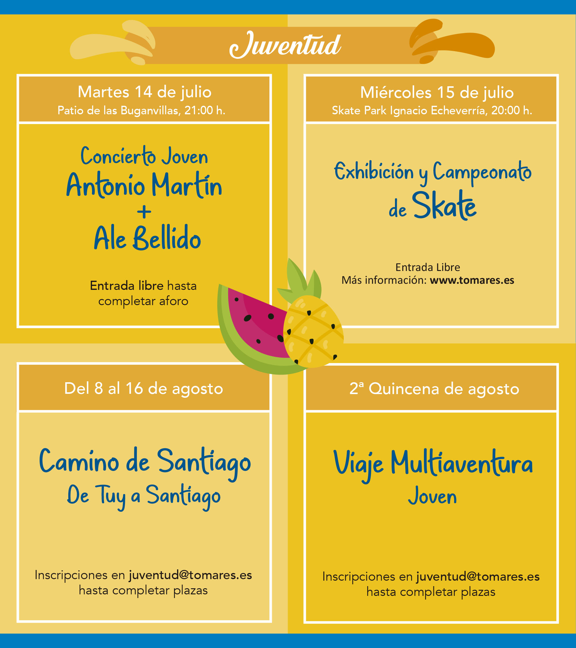 Los tres conciertos, que se engloban dentro de la programación “Tomares, un verano diferente”, serán los martes 14 de julio, 25 de agosto y 1 de septiembre, en el Patio de las Buganvillas del Ayuntamiento. La entrada es gratuita hasta completar aforo, atendiendo a las normas de aforo y distanciamiento dictadas por las autoridades sanitarias.