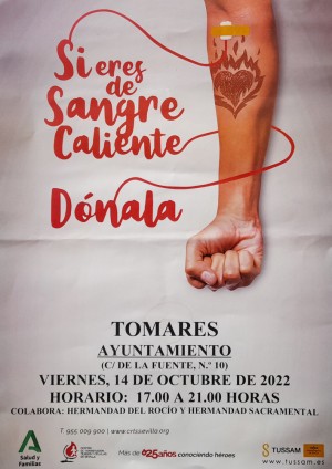 Bajo el lema “Si eres de sangre caliente, dónala”, el Centro de Transfusión realiza un llamamiento a los vecinos de Tomares para que participen activamente, se solidaricen con la campaña y se acerquen a donar. Se necesita sangre de todos los grupos sanguíneos.