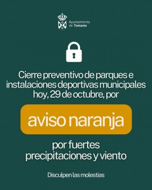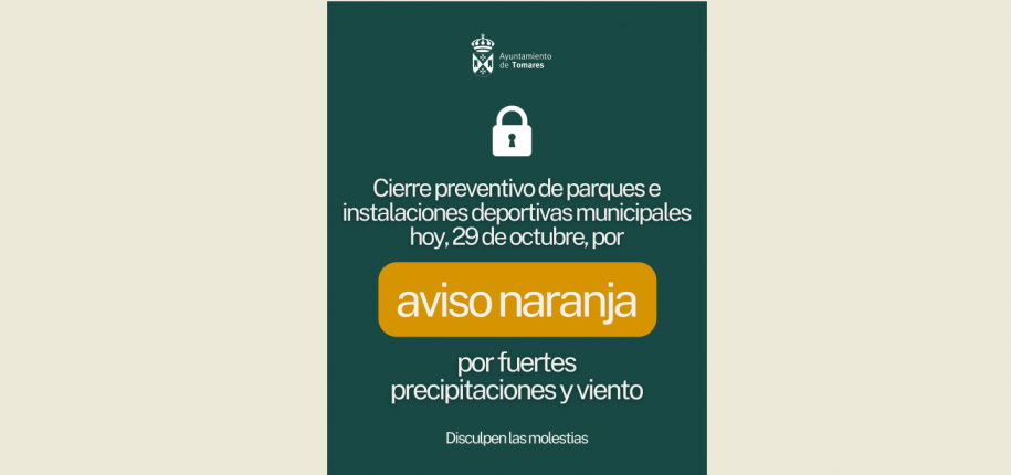 El Ayuntamiento de Tomares cierra, de forma preventiva, los parques e instalaciones deportivas municipales, este miércoles, 29 de octubre, por aviso naranja por lluvias, por fuertes precipitaciones y rachas de viento. También permanecerá cerradas la Biblioteca Municipal. Disculpen las molestias.