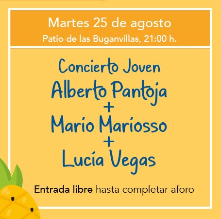 Esta noche tienes la oportunidad de disfrutar de una magnífica velada con los músicos Alberto Pantoja, Mario Mariosso y Lucía Vegas, que ofrecerán hoy martes, 25 de agosto, un gran concierto en el Patio de las Buganvillas de la Hacienda Santa Ana (sede del Ayuntamiento). Entrada gratuita hasta completar aforo. Servicio de ambigú. ¡No te lo pierdas!