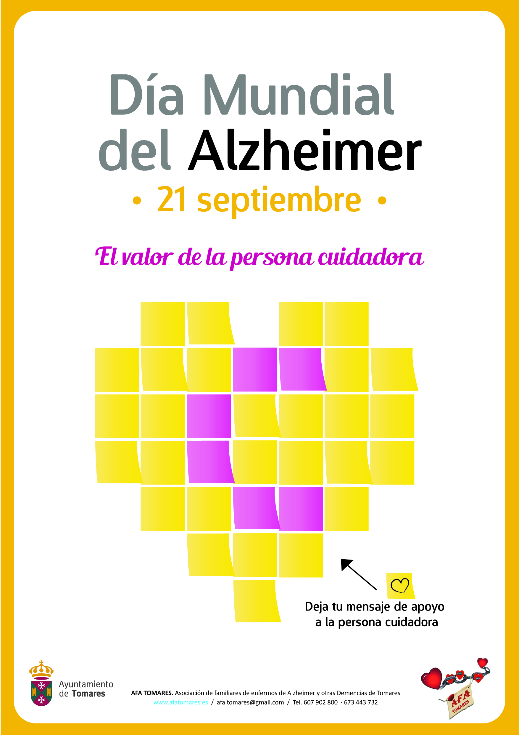 Con motivo del Día Mundial del Alzheimer, que se celebra hoy miércoles, 21 de septiembre, el Ayuntamiento de Tomares se ha sumado a la campaña de la Confederación Española de Asociaciones de Familiares de personas con Alzheimer y otras Demencias (CEAFA), colocando un gran mural en el que se invita a los vecinos a que dejen en post-it mensajes de aliento y apoyo a los del cuidadores de estos enfermos, una figura imprescindible en la lucha contra esta enfermedad.