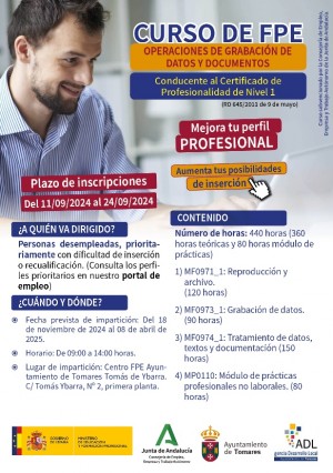 El Ayuntamiento de Tomares, en su apuesta por la formación para el empleo, ha puesto en marcha, a través de su Agencia de Desarrollo Local, un nuevo curso, dentro de su Proyecto "Tomares II. Formando Profesionales", para facilitar a los desempleados el acceso al mercado laboral. Se trata del curso gratuito de Formación Profesional para el Empleo (FPE), "Operaciones de Grabación y Tratamiento de Datos y Documentos", conducente al certificado de profesionalidad de nivel 1, de 440 horas, organizado por el Ayuntamiento de Tomares y subvencionado en su totalidad a través de la Consejería de Empleo, Formación y Trabajo Autónomo de la Junta de Andalucía.