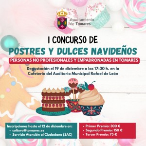 Este año las Navidades en Tomares tendrán un sabor más dulce que nunca. El Ayuntamiento de Tomares ha organizado el I Concurso de Postres y Dulces Navideños de Tomares 2024, novedosa actividad que alegrará la Navidad tomareña con los más exquisitos manjares cocinados por los vecinos: Bizcochos, tartas, turrones, galletas, brazo de gitano, pestiños, etc. El ganador del Primer Premio será galardonado con 300 euros; el Segundo Premio: con 150 euros, y el Tercer Premio con 75 euros.