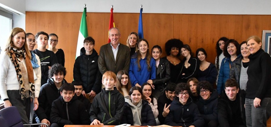 El alcalde de Tomares, José María Soriano, ha recibido en el Ayuntamiento a los estudiantes y profesorado procedentes de Francia y del IES Néstor Almendros que están realizando un intercambio de estudios dentro del Programa Erasmus.