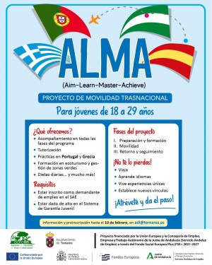 El Ayuntamiento de Tomares, en su apuesta por el empleo, la juventud y la inclusión social, a través de su Agencia de Desarrollo Local (ADL) y los Servicios Sociales Comunitarios, en colaboración con APROFIN (Asociación de Propietarios de Fincas del Medio Natural), se suma a la iniciativa europea de movilidad transnacional “ALMA Andalucía”.
