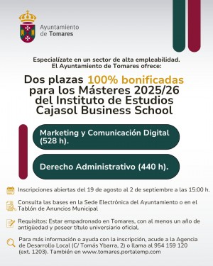 El Ayuntamiento de Tomares, a través de su concejalía de Desarrollo Económico, Comercio, Nuevas Tecnologías y Atención a la Ciudadanía, ofrece dos plazas gratuitas, 100% bonificadas, para estudiar los siguientes Másteres que impartirá el Instituto de Estudios Cajasol Business School, el siguiente curso 2025-26: