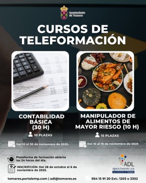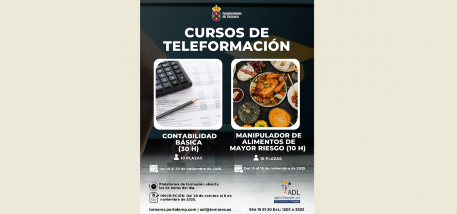 El Ayuntamiento de Tomares, en su apuesta por el empleo y la formación como mejor herramienta para ayudar a encontrar trabajo a las personas desempleadas, ha organizado dos nuevos cursos de formación online: Contabilidad Básica (30 horas) y Manipulador de alimentos de mayor riesgo (10 horas), que contarán con una Plataforma de formación abierta las 24 horas para poderlos realizar de forma cómoda desde casa y en función de su disponibilidad horaria de cada participante. Plazo de inscripciones: del 28 de octubre al 6 de noviembre. Proceso de selección: Por orden de llegada de la solicitud de inscripción (Solo se podrá realizar uno de ellos).