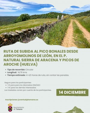 El Ayuntamiento de Tomares ha organizado, dentro de su Programa de “Senderismo y Aventura” 2025-26, una nueva ruta de senderismo para el domingo, 14 de diciembre, que te llevará por una ruta circular con ascenso al Pico Bonales, a 1.055 metros de altitud, desde Arroyomolinos de León, la cima más alta del Parque Natural “Sierra de Aracena y Picos de Aroche” (Huelva). ¡Plazas limitadas! Abierto el plazo de inscripción por orden de llegada, desde este lunes 1 de diciembre, en el email: juventud@tomares.es