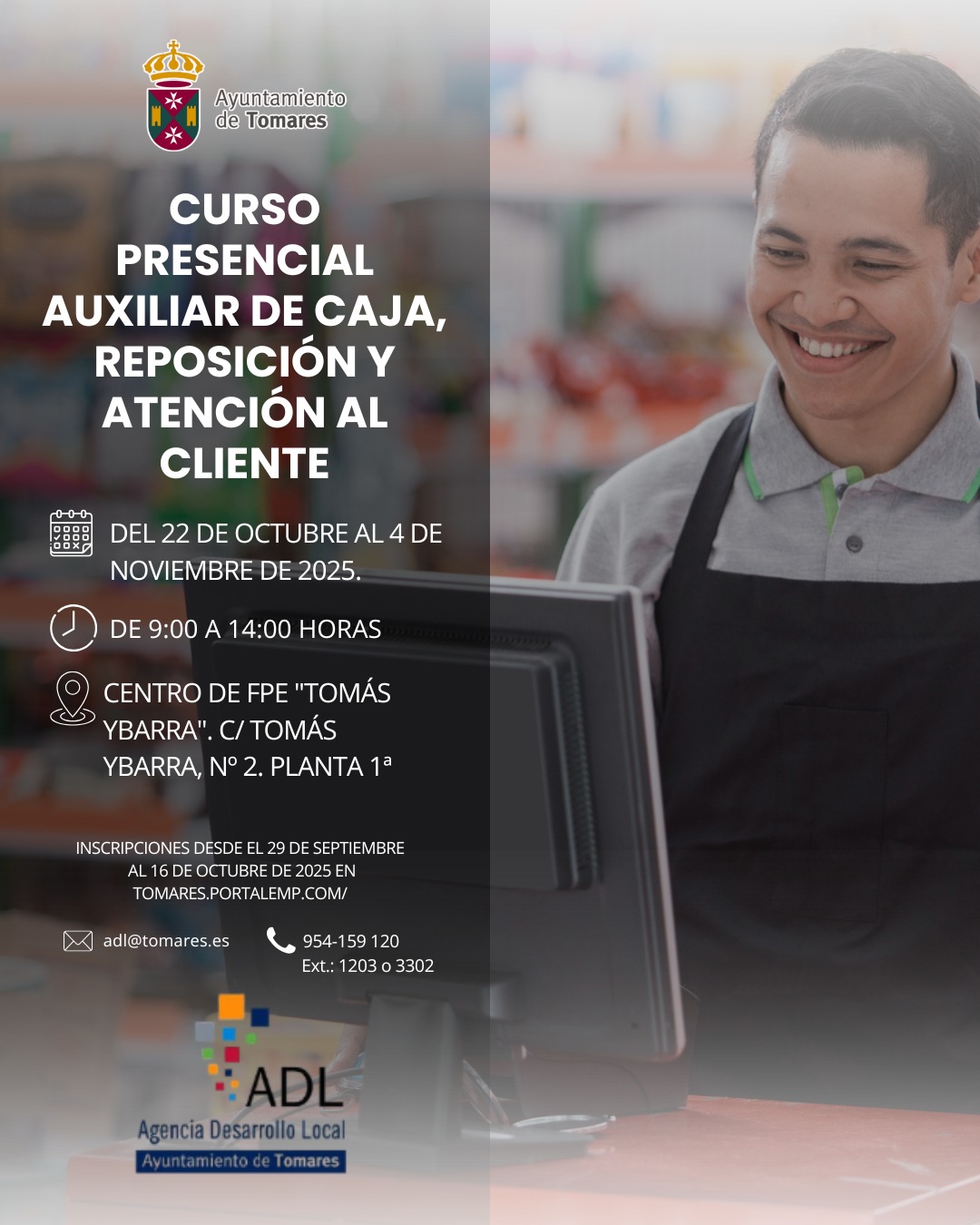 El Ayuntamiento de Tomares, en su apuesta por el empleo, ha organizado un nuevo curso gratuito que permitirá a los participantes especializarse en una profesión con actual demanda de puestos de trabajo, cajero, reponedor o personal de atención al cliente de supermercados o comercios, con el objetivo de ayudar a las personas en búsqueda de empleo del municipio a su inserción laboral.