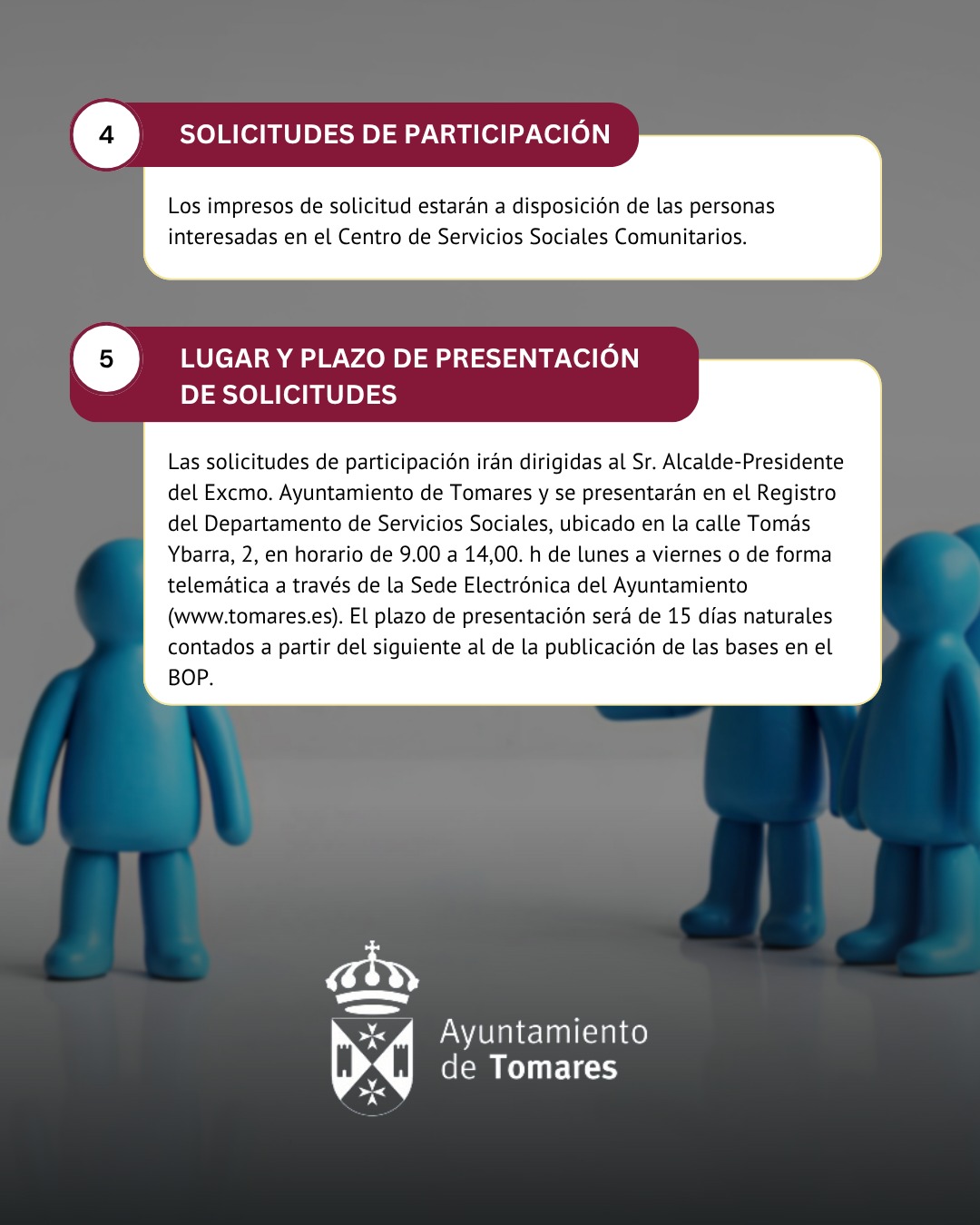 La solicitud se puede descargar al final de esta información, o bien, recoger en la sede de los Servicios Sociales Comunitarios del Ayuntamiento de Tomares (C/ Tomás de Ybarra, 2), de lunes a viernes, de 9:00 a 14:00 horas, donde también se deberá entregar cumplimentada junto a la documentación requerida. También se podrá descargar y presentar forma telemática a través de la Sede Electrónica del Ayuntamiento de Tomares: www.tomares.es: https://tomares.sedelectronica.es/info.0