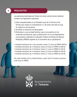 Los requisitos para poder participar en este programa son: estar empadronado en Tomares, acreditar la situación de desempleo, y pertenecer a una unidad familiar que se encuentre en los umbrales económicos, referidos al Indicador Público de Renta de Efectos Múltiples (IPREM). La selección de los participantes y contrataciones se realizarán teniendo en cuenta los siguientes criterios de prioridad:
