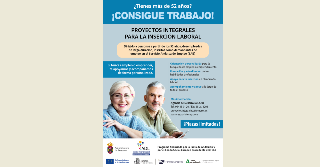 Un completo programa de acompañamiento y formación, gratuito, organizado por el Ayuntamiento de Tomares, en colaboración con la Consejería de Empleo, Empresa y Trabajo Autónomo de la Junta de Andalucía, que será ejecutado hasta junio de 2027, con el que se pretende acompañar a los mayores de 52 años desempleados en su acceso al empleo o en su iniciativa emprendedora o empresarial.