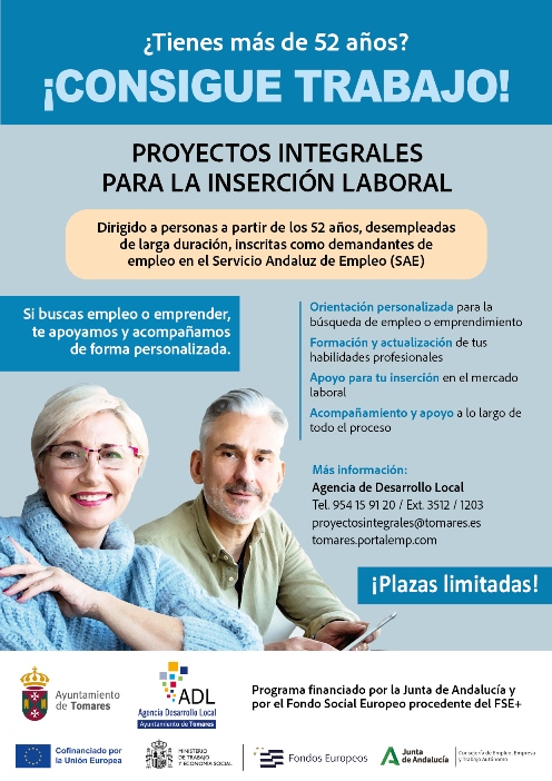 El Ayuntamiento de Tomares, en su apuesta por el empleo y facilitar a las personas que más dificultades tienen para encontrar trabajo el acceso al mundo laboral, va a poner en marcha, por segundo año, el programa de acompañamiento al empleo, Proyectos Integrales para la Inserción Laboral “T-Acompañamos”, dirigido a personas desempleadas de larga duración mayores a partir de 52 años, financiado por la Junta de Andalucía y la Unión Europea a través del Fondo Social Europeo Plus (FSE+), con el objetivo de promover la inserción laboral de los vecinos de Tomares pertenecientes a este colectivo, a través del desarrollo de proyectos integrales de acompañamiento.