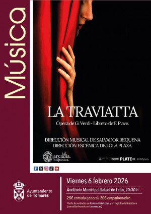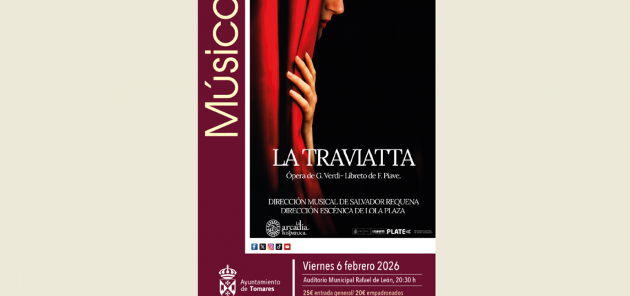 El Ayuntamiento de Tomares, con el objetivo de seguir acercando la cultura de calidad a los vecinos y los espectáculos de más éxito que se están representando en los principales teatros de España, estrenará la nueva temporada de su Ciclo de “Teatro, Ópera y Danza” 2026, este viernes, 6 de febrero, con una de las óperas más destacadas de la historia de la música y una de las más populares y representadas en el mundo: “La Traviata”, compuesta y estrenada por Giuseppe Verdi en 1853 en Venecia, con libreto de Francesco Maria Piave, basada en la novela La dama de las camelias de Alexandre Dumas (hijo). Será a las 20:30 horas, el Auditorio Municipal Rafael de León. ¡Últimas entradas a la venta!