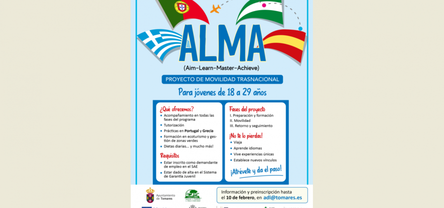 El Ayuntamiento de Tomares, en su apuesta por el empleo, la juventud y la inclusión social, a través de su Agencia de Desarrollo Local (ADL) y los Servicios Sociales Comunitarios, en colaboración con APROFIN (Asociación de Propietarios de Fincas del Medio Natural), va a poner en marcha la iniciativa europea de movilidad transnacional “ALMA Andalucía”.