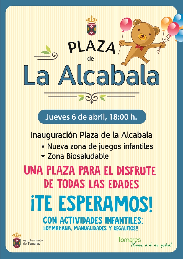 Los vecinos de Tomares van a poder disfrutar de una nueva zona de juegos infantiles y bio-saludables para practicar deporte en la Plaza de La Alcabala, situada en Rotonda de la Era (Santa Eufemia), la cual será inaugurada por el Ayuntamiento de Tomares hoy jueves, 6 de abril, a las 18 horas.
