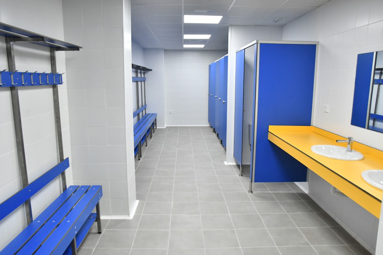 La nueva edificación, que se ha informatizado y que se amplía de 2 a 4 vestuarios y de 8 a 20 cabinas con duchas separadas (5 en cada vestuario) alberga dos grandes aseos (uno masculino y otro femenino), dos baños independientes para los árbitros, una sala de masaje, una lavandería, un despacho, un almacén de equipaciones y otro, deportivo. Las puertas y divisiones de las estancias están realizadas con cabinas de tablero fenólico.