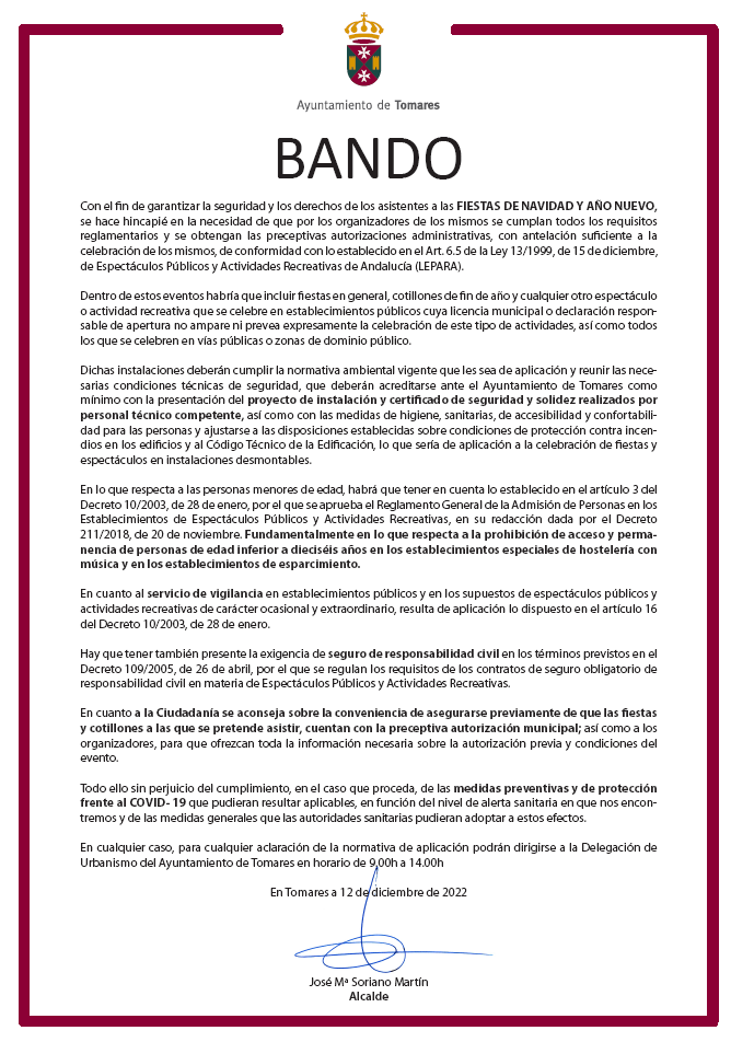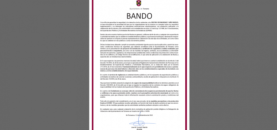 EL AYUNTAMIENTO INFORMA: BANDO MUNICIPAL SOBRE LAS FIESTAS NAVIDEÑAS 14/12/2022ociojuventudfamiliafestejoseventosespectáculos El Ayuntamiento de Tomares informa sobre el siguiente Bando Municipal relativo a las Fiestas Navideñas. Aquí dentro podrá descargarlo en pdf o leerlo. Documentos relacionados: BANDO MUNICIPAL SOBRE LAS FIESTAS NAVIDEÑAS