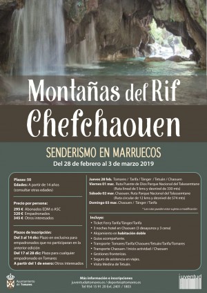 Dado el éxito del primer viaje a Marruecos del pasado mes de noviembre, en el que participaron medio centenar de tomareños, el Ayuntamiento de Tomares ha organizado, para aquellos que se quedaron sin plaza, un segundo viaje en el que se visitará también la medina de Tánger, el precioso y pintoresco pueblo de Chefchaouen y se hará senderismo por las Montañas del Rif, con visita el Parque Nacional del Talassemtane y ascensión en 4x4 al Jbel Lakraa, bosque de Pinsapos. Lugares imprescindibles que el viajero debe conocer si visita Marruecos. Será para el próximo Puente de Andalucía, del 28 de febrero al 3 de marzo. Plazas limitadas.