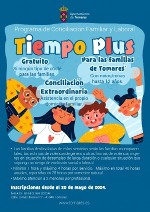 Con el objetivo de facilitar a las familias tomareñas la conciliación familiar y laboral, el Ayuntamiento de Tomares, a través de su Concejalía de Bienestar Social, va a poner en marcha un novedoso Programa de Conciliación Familiar y Laboral, “Tiempo Plus”. Un nuevo servicio, pionero en el municipio, que facilitará a las familias desfavorecidas “Canguros a Domicilio”, profesionales que cuidarán de las personas menores de edad en el domicilio familiar mientras sus padres trabajan, y les acompañarán a sus centros escolares tanto a la entrada como a la salida de las clases.