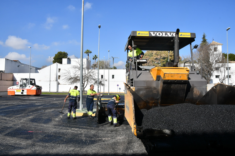 El Ayuntamiento de Tomares está reasfaltado el aparcamiento municipal situado junto al Ayuntamiento y El Mercadona.