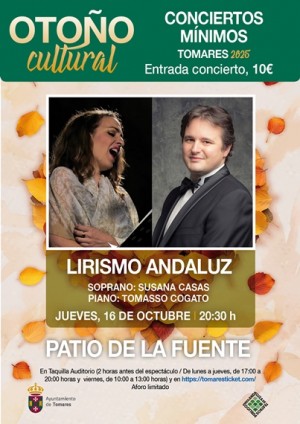 Jueves, 16 de octubre: “LIRISMO ANDALUZ”, COMPOSICIONES, DRAMATURGIA Y POESÍA ANDALUZA, con la bella voz de la reconocida soprano española Susana Casas y el premiado pianista italiano, Tomasso Gogato. El dúo formado en Sevilla nace con el propósito de investigar y difundir el repertorio lírico de las músicas de salón, tanto aquel perteneciente a la tradición netamente centroeuropea, que se desarrolló extraordinariamente durante el Romanticismo, como aquellos otros repertorios pertenecientes a géneros meridionales nacidos en Italia y España. Susana Casas es Licenciada en Teatro Lírico en la especialidad de Ópera y Zarzuela en Madrid y desarrolla su carrera trabajando como solista en diversas óperas, zarzuelas y revistas en todo el territorio español. Tomasso Cogato es ganador del Concurso Internacional de Piano Ciudad de Ferrol y ha sido galardonado con el tercer premio en el prestigioso José Iturbi Piano Competition de Los Ángeles. Entradas: 10 euros, en la Taquilla de la web del Ayuntamiento de Tomares: aquí: https://www.giglon.com/todos?idEvent=susana-casas---tommaso-cogato