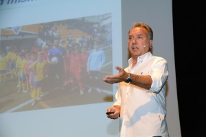 El ex árbitro de fútbol profesional español que actualmente es adjunto a la dirección técnica del Comité de Árbitros de la Real Federación Española de Futbol (RFEF) como responsable de los árbitros de Segunda División B, instó al numeroso público que acudió a escucharle al Auditorio Municipal Rafael de León a practicar deporte para pasarlo bien y llevar una vida sana, y no para competir.
