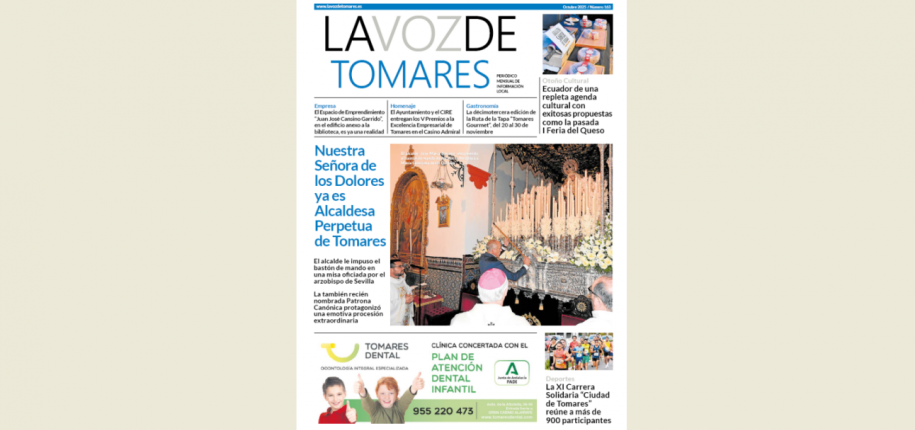 “La Voz de Tomares” abre en portada con la proclamación de la Virgen Ntra. Sra. de los Dolores como Alcaldesa Perpetua de Tomares y Patrona Canónica, y su emotiva salida extraordinaria. También dedica sus primeras páginas a los V Premios a la Excelencia Empresarial “Ciudad de Tomares” 2025, al nuevo Espacio de Emprendimiento “Juan José Cansino Garrido”, al avance de las obras de la carretera A-8063 que comunica Tomares con Bormujos o al inicio de las obras del Proyecto de Seguridad Vial del municipio. Nuevo ejemplar en el que además encontrará información sobre la inminente XIII Ruta de la Tapa “Tomares Gourmet”, del 20 al 30 de noviembre, así como toda la programación cultural, deportiva y de ocio organizada por el Ayuntamiento para el mes de noviembre