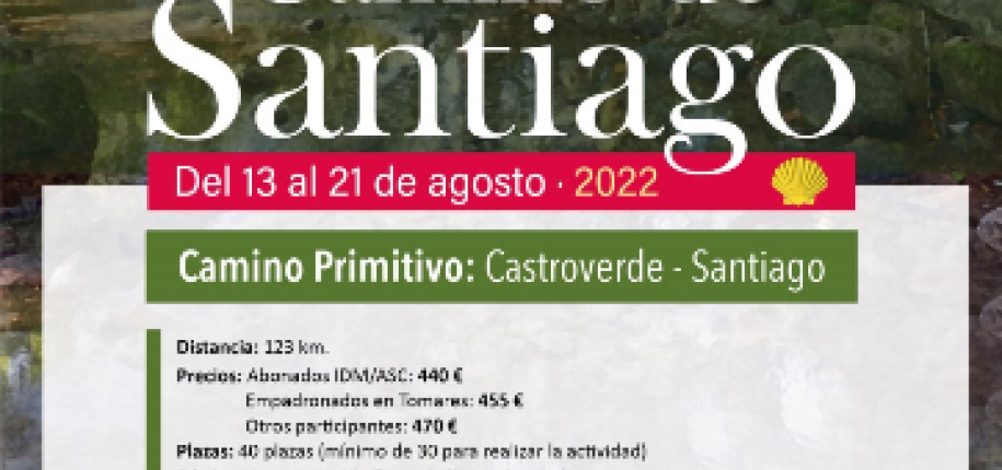 El Ayuntamiento de Tomares vuelve a organizar el El Camino de Santiago, que este año 2022 se realizará del 13 al 21 de agosto y cubrirá el recorrido del Camino Primitivo, que va desde Castroverde, en Lugo, hasta Santiago de Compostela, con un total de 123 kilómetros.