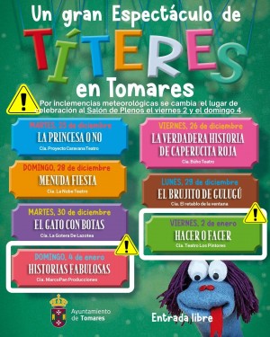 El Ayuntamiento de Tomares informa que debido a las inclemencias meteorológicas, la última función que queda del Ciclo de Títeres, “Historias Fabulosas” (Cía. MarcoPan Producciones), que se iba a representar este domingo, 4 de enero, en la Plaza de la Constitución, a las 12:30 horas, cambia de sitio: Será en el Salón de Plenos del Ayuntamiento de Tomares (C/ de la Fuente, 10). Entrada libre hasta completar aforo. Disculpen las molestias