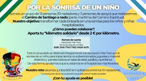 Se trata de la Ruta Espiritual, un recorrido que une mar y tierra, y que nunca antes nadie ha completado a nado. Así nació este proyecto único, cargado de simbolismo, superación y espíritu peregrino, que combina deporte, naturaleza y espiritualidad. Lo recaudado se destinará a beneficio de la Asociación sin ánimo de lucro “Mar Pozo, Por la sonrisa de un niño” para la financiación de tratamientos no cubiertos, compra de juguetes, material educativo y conseguir unas instalaciones más lúdicas para los pequeños hospitalizados en el Virgen Macarena.