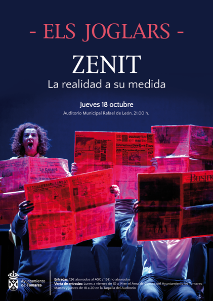 Será la primera vez que esta agrupación teatral, una de las más longevas y estables de Europa, actúe en Tomares. Una magnífica ocasión para disfrutar del impecable buen hacer de los actores Pilar Sáenz, Dolors Tuneu, Xavi Vilà, Julián Ortega y Juan Pablo Mazorra, junto con Ramón Fontserè, director y componente también del elenco artístico de Els Joglars. Ellos nos invitarán a ser partícipes de los entresijos del día a día en la redacción del periódico “Zenit”, a observar el comportamiento de periodistas convertidos en “media workers” y los enfrentamientos entre el periodismo ético y las exigencias de las ventas y los resultados, el sensacionalismo y la influencia.