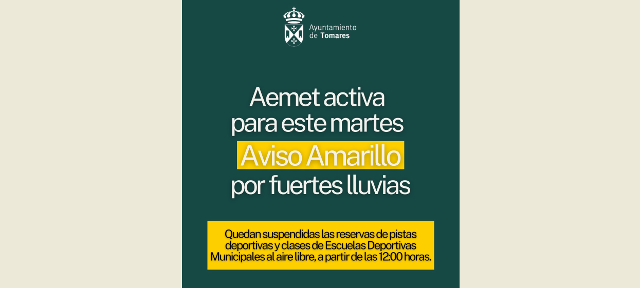 El Ayuntamiento de Tomares informa que, este martes, 13 de enero, debido al Aviso Amarillo por fuertes lluvias activado por la Agencia Estatal de Meteorología (AEMET), y con el fin de preservar la seguridad de todos los usuarios, de manera preventiva, quedan suspendidas las reservas de pistas deportivas y clases de las Escuelas Deportivas Municipales (EDM) que se desarrollan al aire libre, a partir de las 12:00 horas del mediodía. Disculpen las molestias.