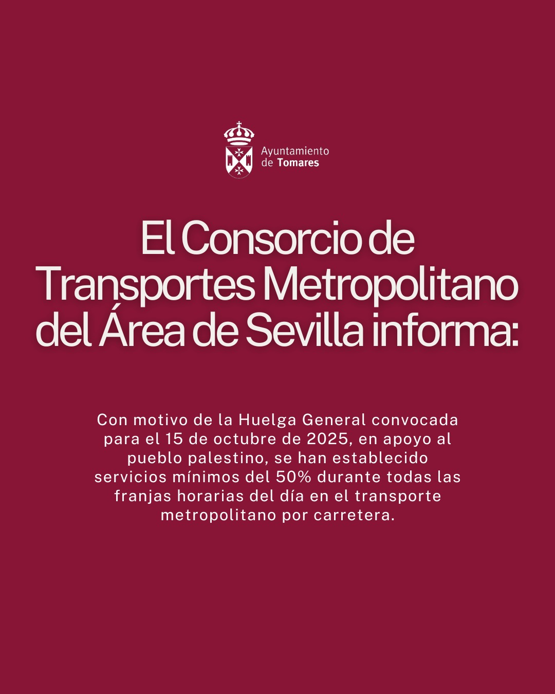 El Consorcio de Transporte Metropolitano del Área de Sevilla informa que, con motivo de la Huelga General convocada para este miércoles, 15 de octubre de 2025, en apoyo al pueblo palestino, en el ámbito de la Comunidad Autónoma de Andalucía se establecen servicios mínimos del 50% en el ámbito de transporte metropolitano por carretera para todas las franjas horarias del día.