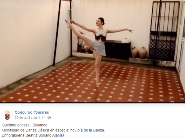 Mucho arte y grandes habilidades para el baile es lo que han demostrado los numerosos vecinos que han participado enviando sus coreografías al Concurso #QuedateEnCasa… Bailando!!!, organizado por la concejalía de Cultura del Ayuntamiento de Tomares en las modalidades de Hip-Hop Funky, Flamenco, Sevillanas, Danza Clásica y Bailes Latinos, con el objetivo de hacer más llevadero a los tomareños el confinamiento en casa y hacer pasar a las familias un rato divertido.